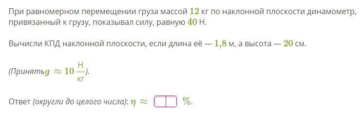 Η = Ап / Аз = mgh / (FS) = 12 * 10 * 0, 2 / (40 * 1, 8) = 0, 33 * 100% = 33%.