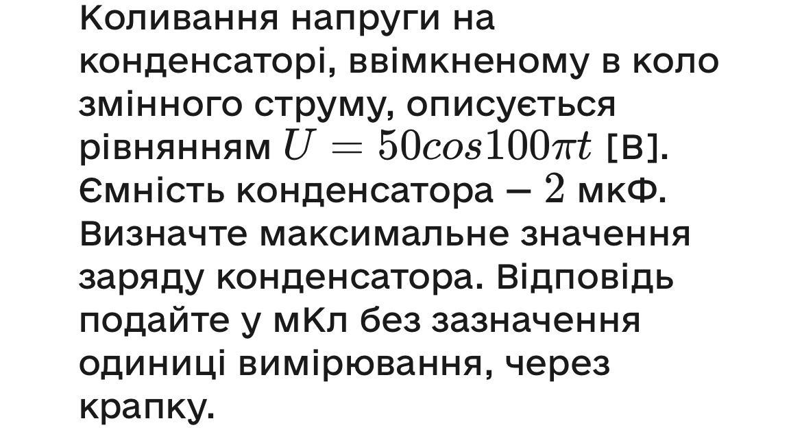 ![Коливання напруги на конденсаторі, ввімкненому в коло змінного струму, описується рівнянням U = 50cos100πt [В]?](https://media.my-dict.ru/q/2024/10/12/6621c941ed7e556ecc18cc1a/0_66226fae507946.97843946.jpeg)